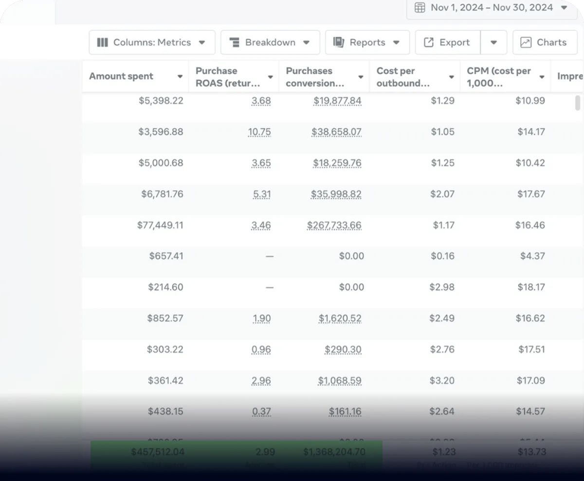 In November 2024 alone, I managed over $458k in ad spend across Meta platforms — Every dollar was tracked, optimized, and reinvested to drive profitable, scalable growth.